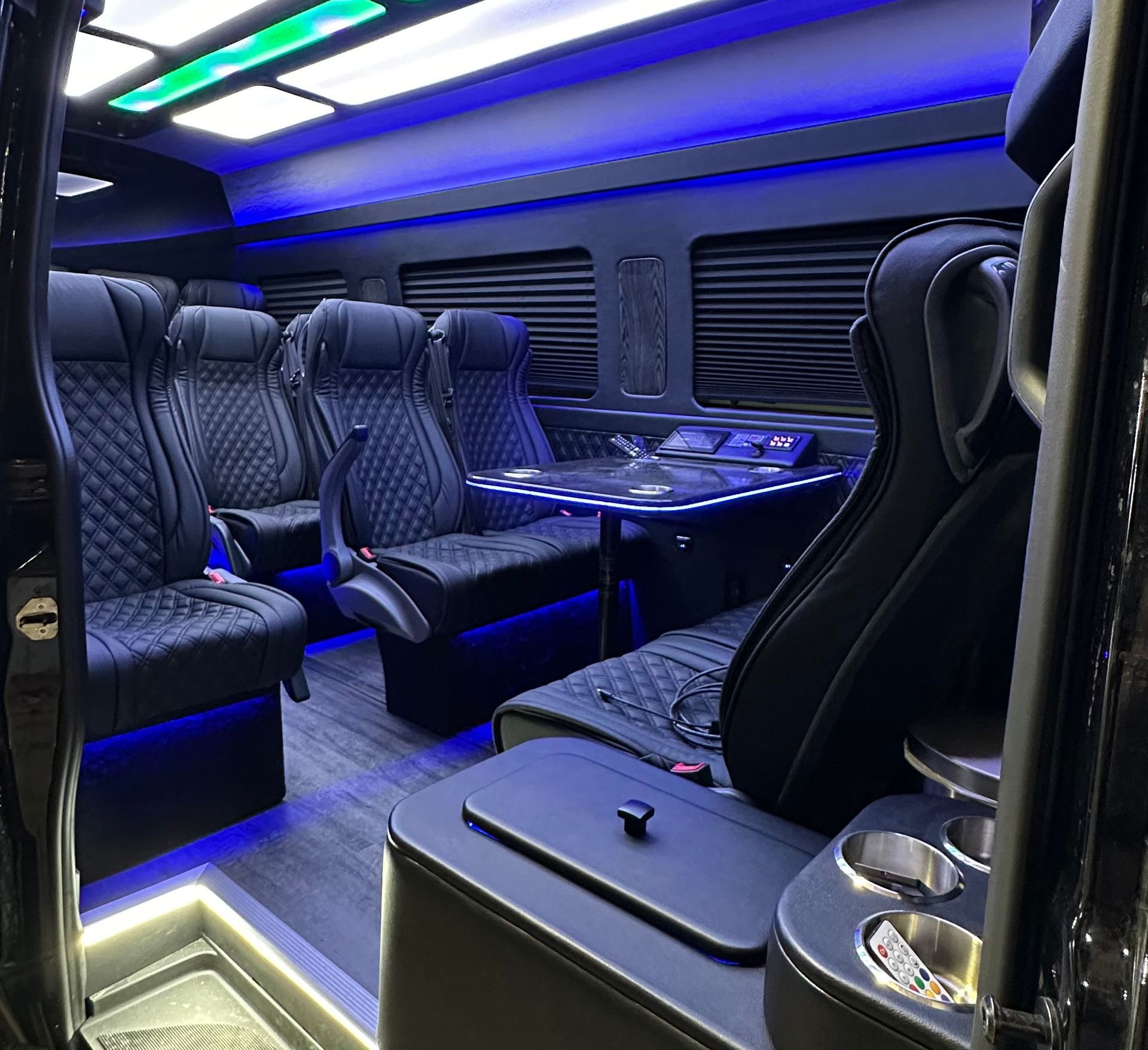 At Macoul Transportation, our Mercedes-Benz Sprinter fleet includes 14-passenger executive Sprinters, 8-passenger jet Sprinters, and 14-passenger limo-style Sprinters, offering the perfect combination of comfort and sophistication. Designed for corporate travel, entertainment industry needs, and VIP experiences, each Sprinter is equipped with two live TVs, beverage coolers, refrigeration, LED lighting, an intercom system, USB ports in every row, reclining seats, privacy shades, WiFi, and rear door advertising options. Whether for business or leisure, our chauffeur-driven Sprinters provide a seamless, stylish, and high-end travel experience tailored to your needs.